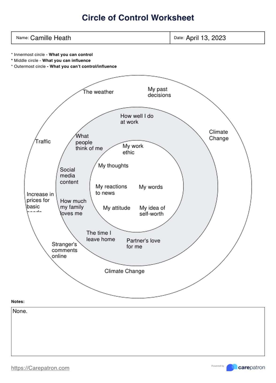 The Circle of Control Worksheet is a visual representation of the things you can control, influence, and let go of. It consists of three concentric circles: the inner circle represents things within your control, the middle circle represents things you can influence, and the outer circle represents things you cannot control.