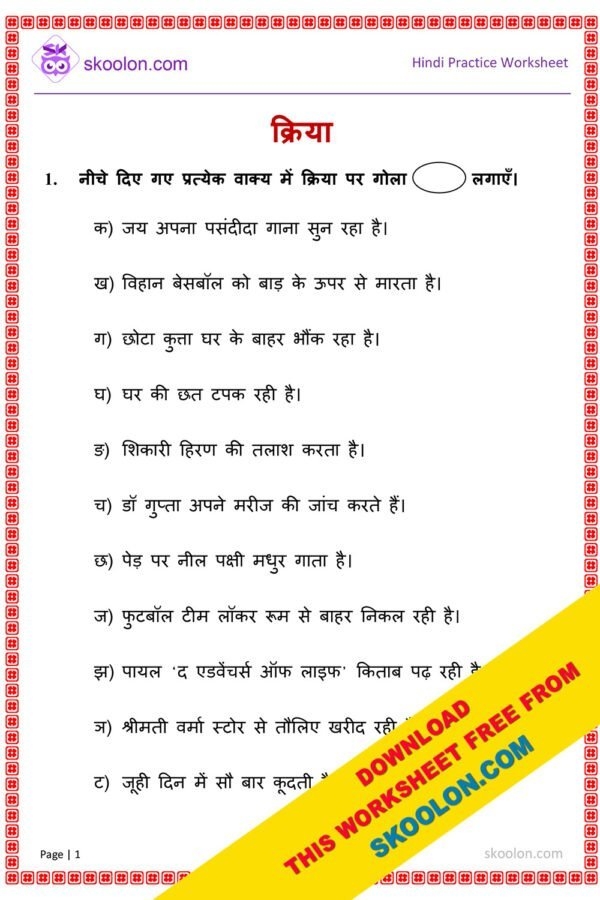 Hindi Grammar Kriya Worksheet 5 Skoolon