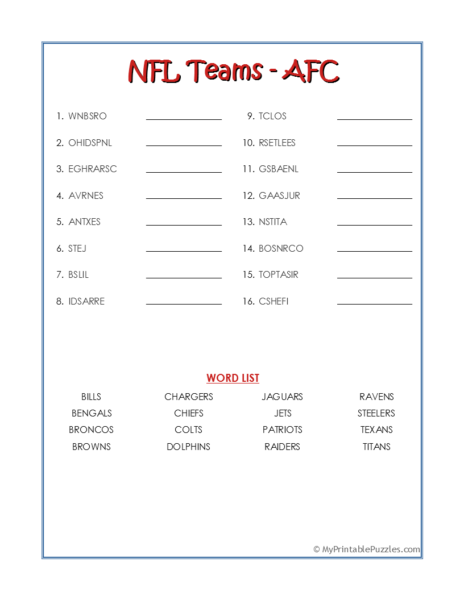 NFL Teams Crossword Puzzle My Printable Puzzles