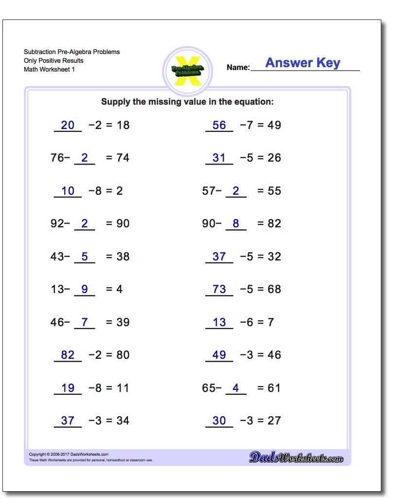 Subtraction Pre Algebra WorksheetsSubtraction Pre Algebra Worksheets