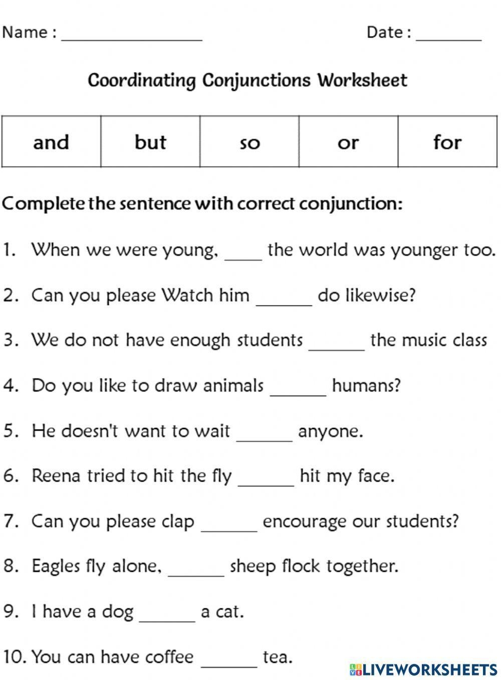 By using a conjunction worksheet for class 6, students can practice identifying different types of conjunctions, such as coordinating conjunctions (and, but, or), correlative conjunctions (either/or, neither/nor), and subordinating conjunctions (because, although). These worksheets often include a variety of exercises, such as fill-in-the-blank sentences, matching activities, and sentence combining tasks, to help students practice using conjunctions in context.