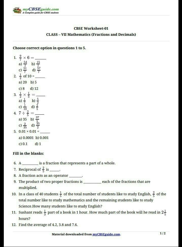 Fraction And Decimals Class 7 Worksheet FractionsWorksheets