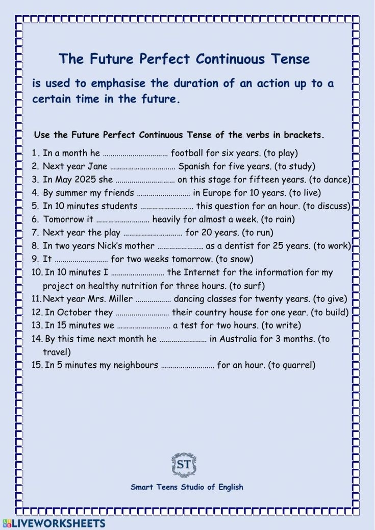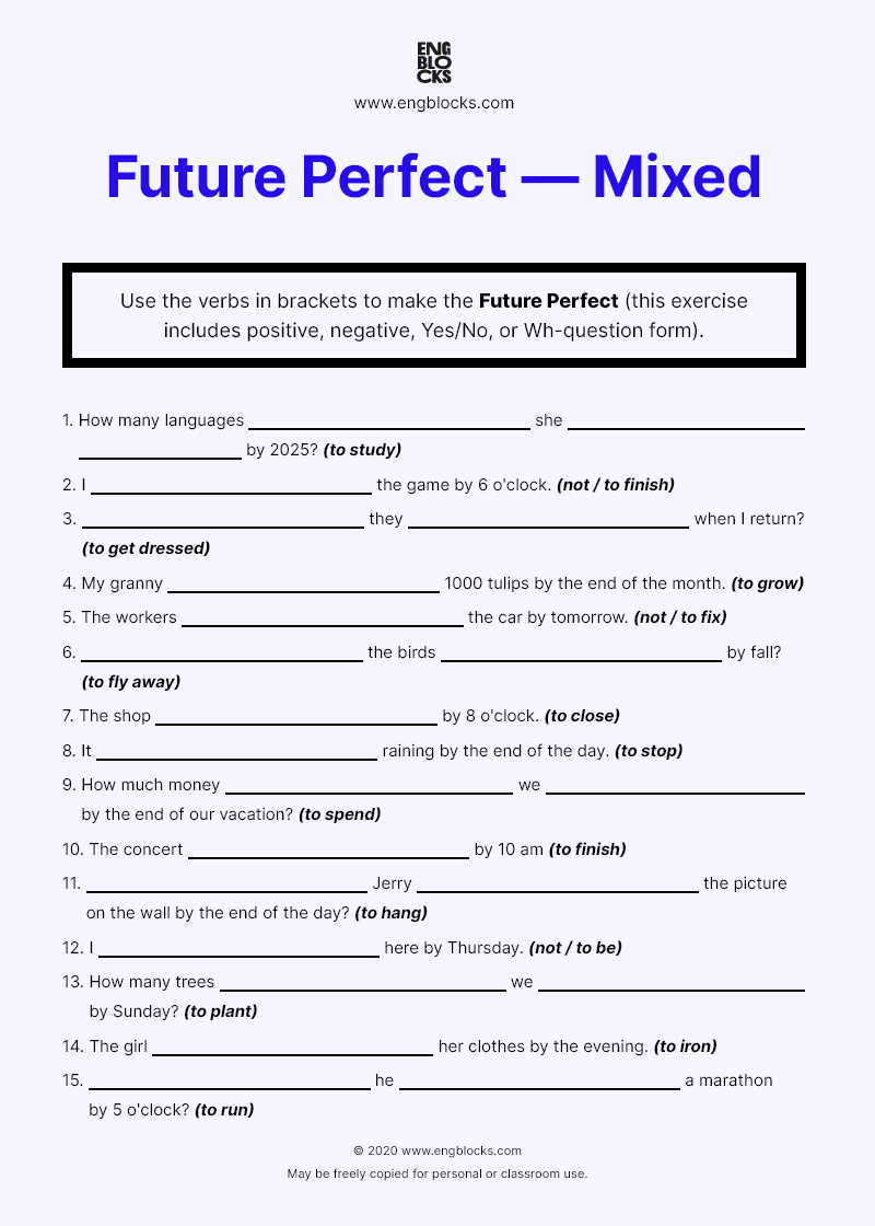 With clear explanations and plenty of practice exercises, this worksheet is designed to make learning future perfect tense simple and enjoyable. Whether you’re a teacher looking for classroom materials or a student wanting to improve your grammar skills, this worksheet is sure to meet your needs.