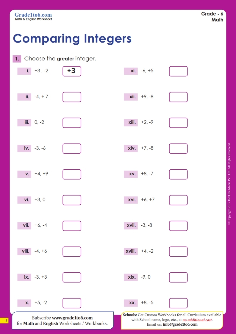 Integers Class 6 WorksheetIntegers Class 6 Worksheet
