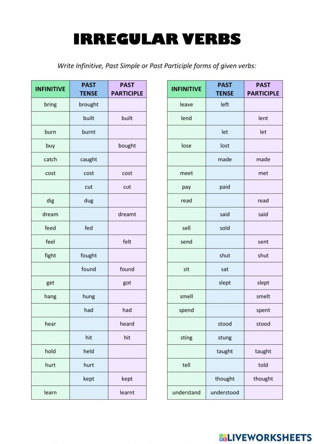 Learning irregular verbs can be a challenging task for many students, but with the right resources, it can become much easier. One of the most effective tools for practicing irregular verbs is a worksheet. Irregular verbs worksheets help students reinforce their knowledge and understanding of these tricky verbs in a fun and interactive way.