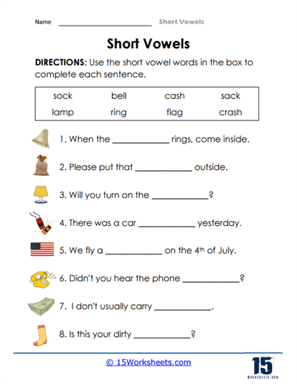 Another common activity is the fill-in-the-blank exercise, where students are given a sentence with missing vowels that they must complete. This challenges students to apply their knowledge of vowel sounds in context and improves their ability to read and comprehend text.