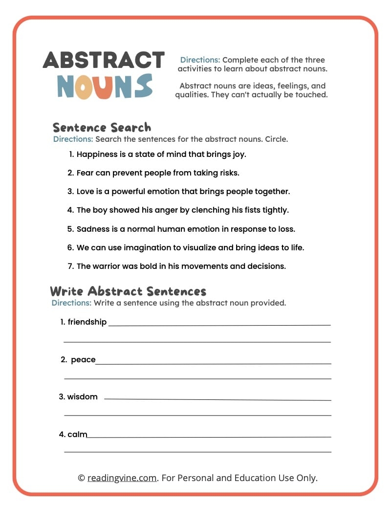 Abstract Noun Worksheets Definition And Examples ReadingVine