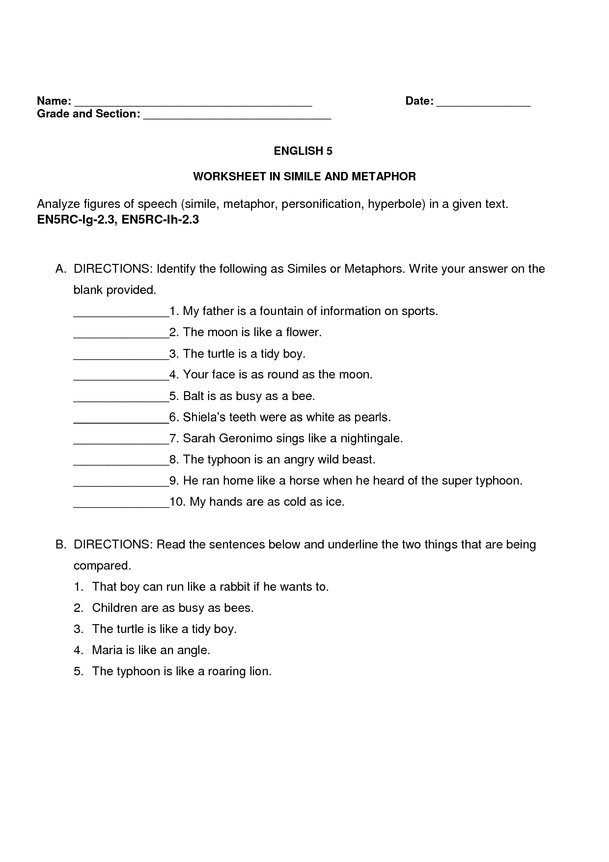 SOLUTION Worksheet In Simile And Metaphor Studypool Worksheets Library