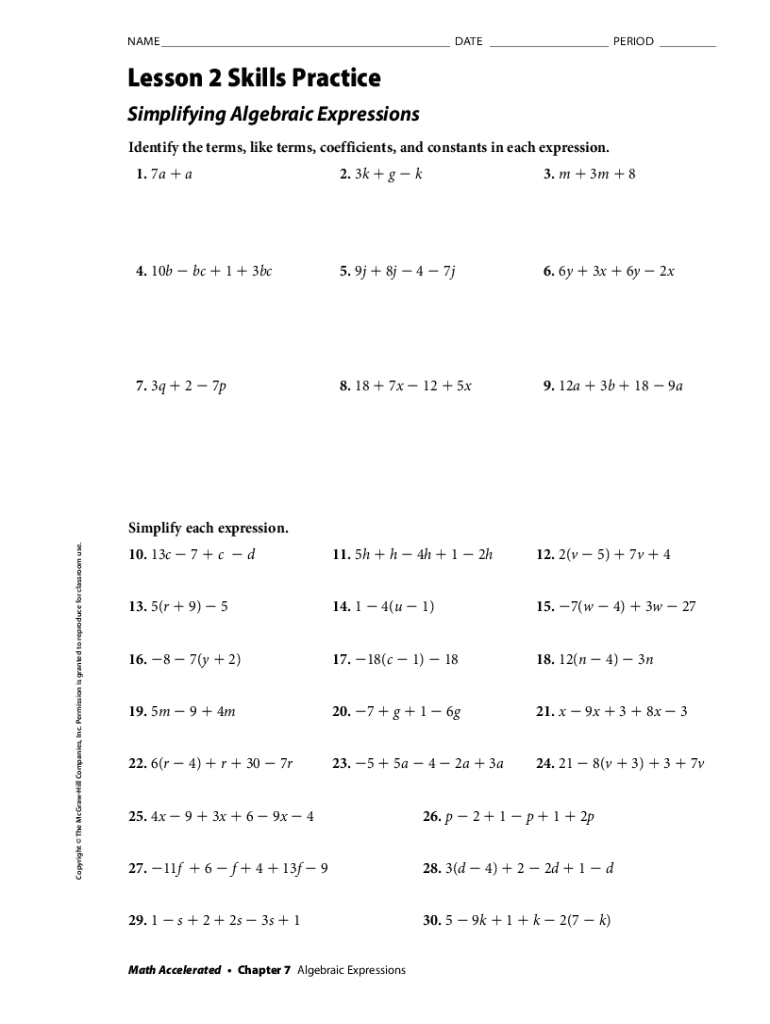 These worksheets typically include a variety of problems that require you to simplify algebraic expressions by combining like terms, distributing, and applying other algebraic rules. By working through these problems, you can improve your understanding of the concepts and develop your problem-solving skills.