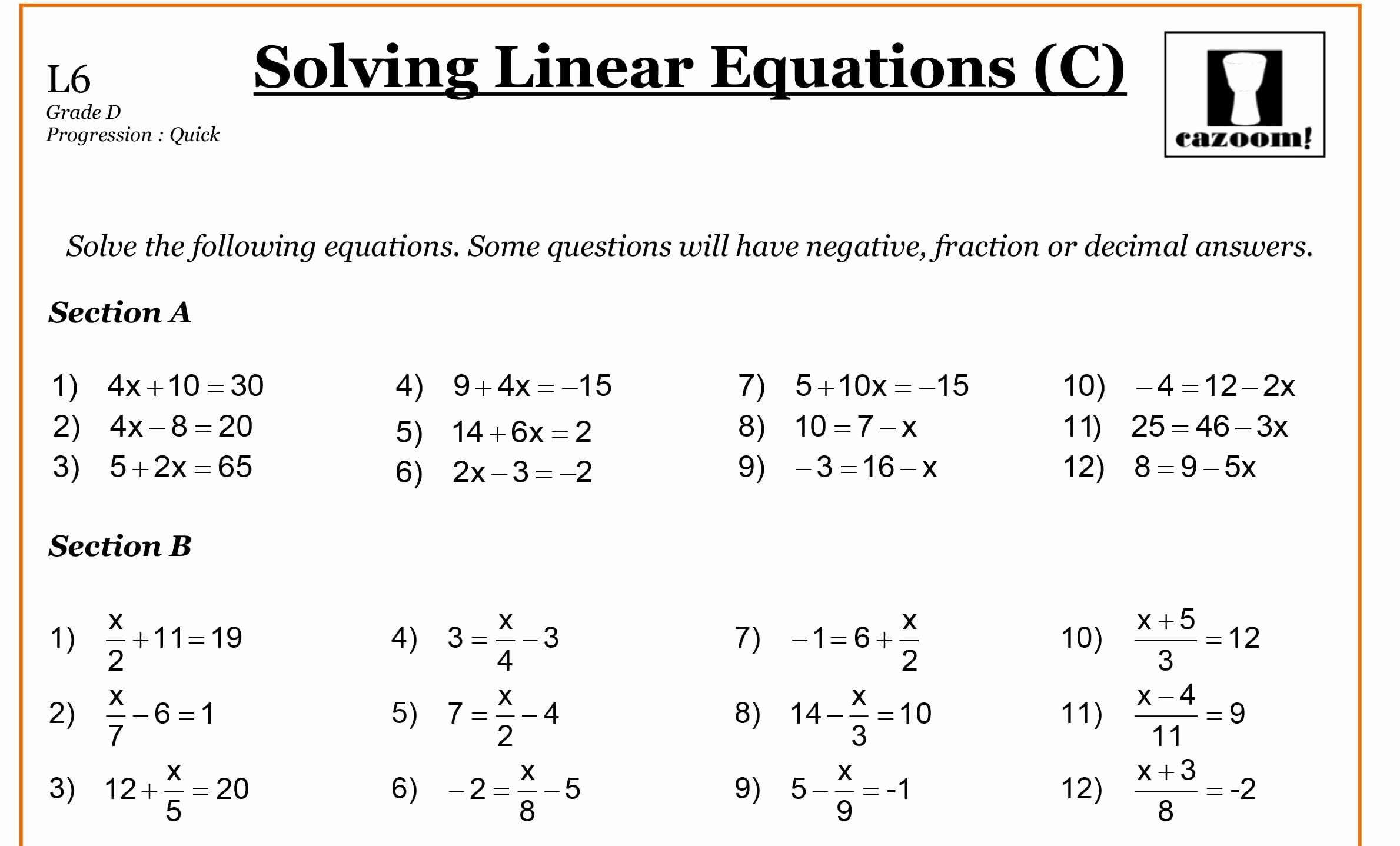 Solving Linear Equations A Worksheet Cazoom Maths Worksheets Solving Linear Equations A Worksheet Cazoom Maths Worksheets