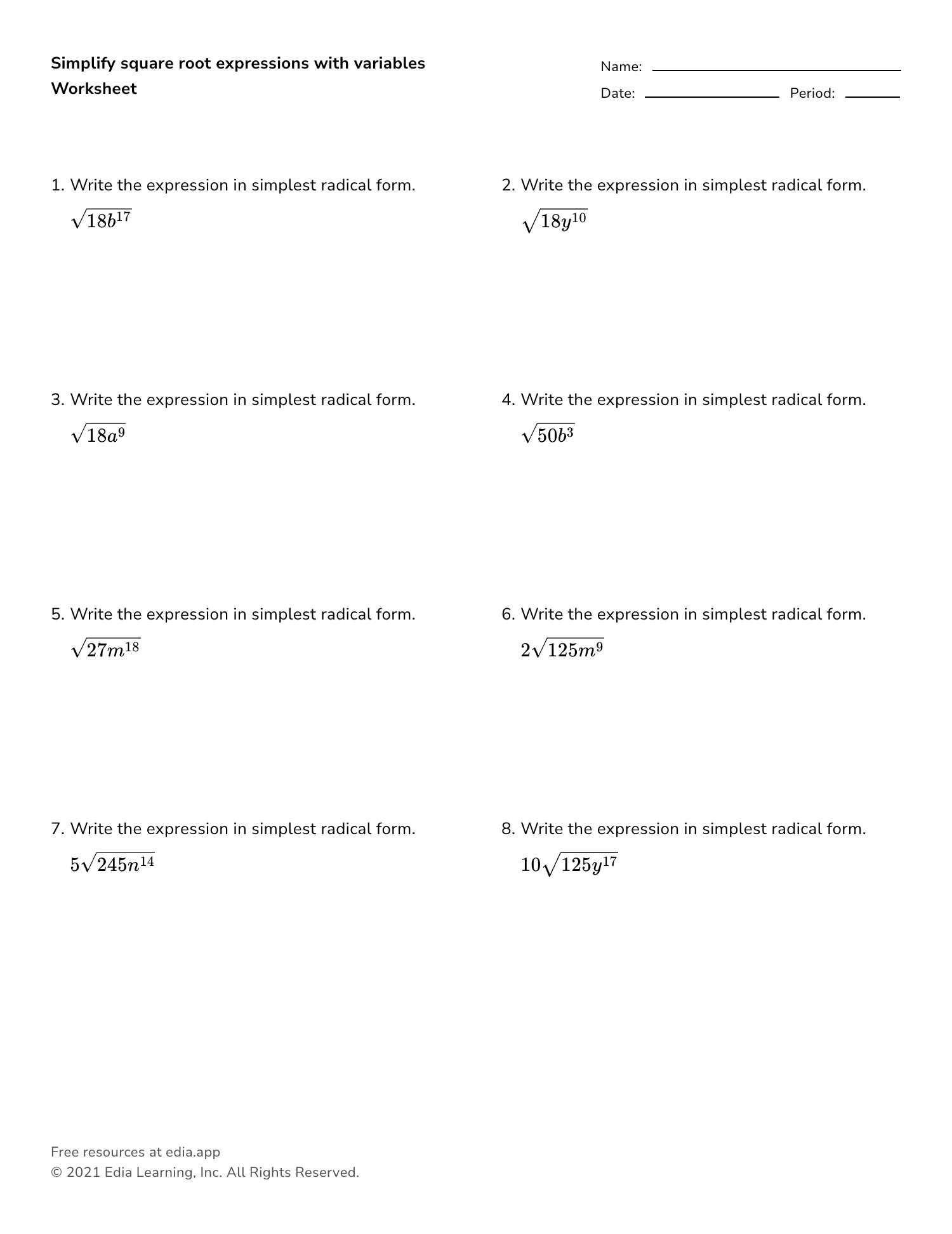 Simplify Square Root Expressions With Variables Worksheet Simplify Square Root Expressions With Variables Worksheet